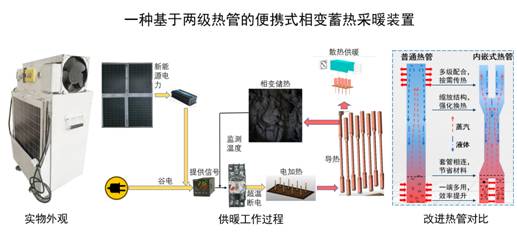 88858cc永利官网赵佳腾老师与饶中浩老师带领的团队设计了一种基于两级热管传热的,通过电加热将谷电和以太阳能为主的新能源电力以热能的形式储存在复合相变材料中。将相变储能技术和新型热管的传热特性充分结合,集热管传热、相变储能、温度调控、系统电控、便携驱动、谷电和光电供能等为一体的便携式移动蓄热采暖系统。平衡了峰谷电压并解决了现有采暖设备的安全性和复杂性等问题。在一定程度上还增大了新能源的消纳量。该系统建造和使用的成本低,清洁环保,为我国节能减排和可持续发展事业提供了一定的理论依据。