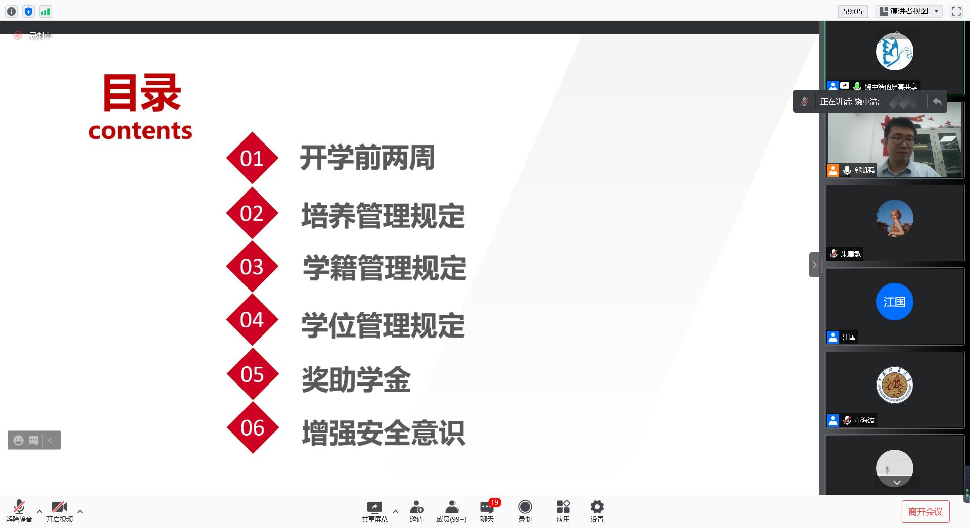 最后,研究生辅导员郭凯强老师召开年级大会,向每位参会同学介绍了学院的日常管理规章制度,包括健康打卡、晚点名、时间观念的养成、奖惩制度以及请销假制度,并鼓励大家好好学习,努力提高自己的科研能力和学生工作水平,劳逸结合,做最好的自己,学院将会是大家坚实的后盾。