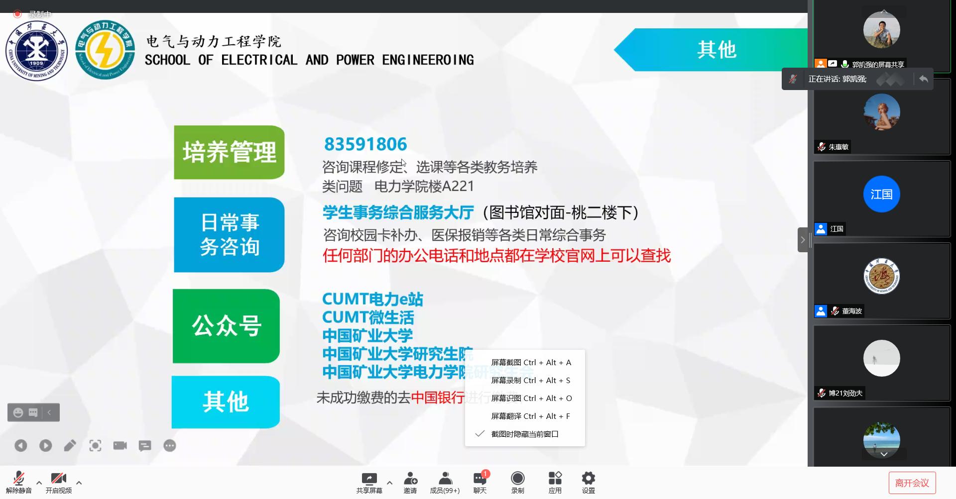 2021年9月28日晚上19时,电气与动力工程学院2021级研究生新生入学教育报告会因疫情原因线上举行,学院副院长饶中浩、行政副院长江国、实验室董海波老师出席会议,电气与动力工程学院全体2021级研究生新生参加了此次报告会。报告会由研究生辅导员郭凯强主持。