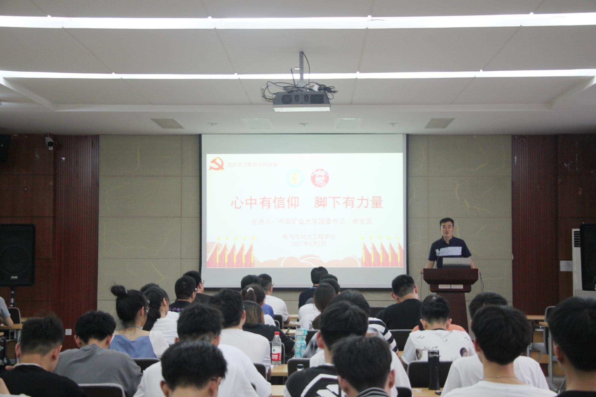 为推进88858cc永利官网党史学习教育工作,进一步提高团学骨干和广大青年团员的思想道德修养和政策理论水平,帮助全体学员明确青年马克思主义者所要履行的责任义务,电力学院于6月2日晚在学院B518报告厅举行以“心中有信仰,脚下有力量”为主题的青马班第三场讲座。本次讲座邀请了中国矿业大学团委书记谢发国主讲,电力学院党委副书记于基伯、团委书记郭凯强、各年级辅导员与青马班全体学员出席参加此次讲座。于基伯副书记主持讲座。