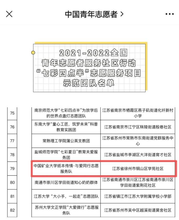 近日,团中央青年志愿者行动指导中心、中国青年志愿者协会秘书处联合中国平安人寿保险股份有限公司、东京海上控股株式会社面向全国征集遴选一批青年志愿者服务社区行动“七彩四点半”示范团队,88858cc永利官网“纸本传情·与爱同行”志愿服务队作为徐州市的唯一一支队伍成功入围。