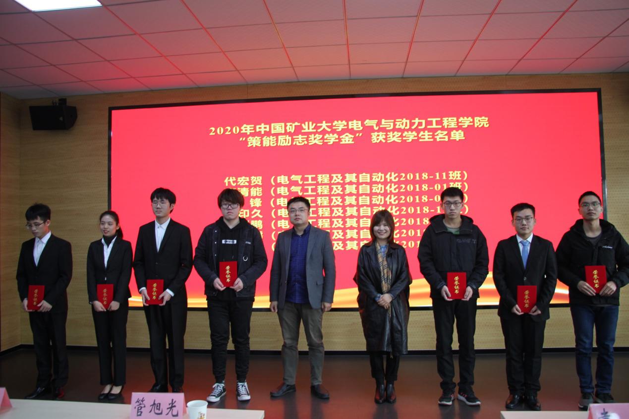 电气01级校友管旭光、行管02级校友祝莹莹为获得“策能励志奖学金”学子颁奖