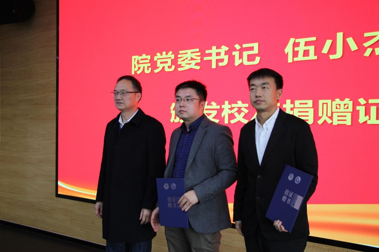 院党委书记伍小杰教授致辞,代表学院对优秀校友们为院校教育事业发展提供的支持表示衷心的感谢,并表达了对获奖同学的殷切祝福。他希望获奖同学树立感恩意识,以实际行动回馈国家和社会,以坚忍不拔的精神砥砺前行,做有担当、有本领、有情怀的优秀学子,为国家发展和社会进步做出贡献。随后,伍小杰书记代表学院感谢长期以来关心和支持学院发展的企业并向校友颁发捐赠证书。院工会主席胡堃宣读企业奖学金表彰决定,与会企业校友分别为获得奖学金的学生颁发了荣誉证书并合影留念。