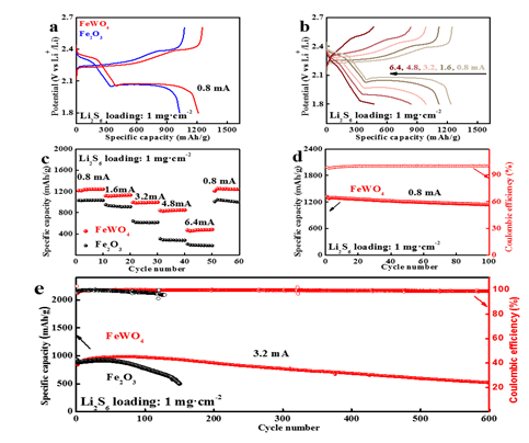相关研究以“Regulating the polysulfide redox kinetics for high- performance lithium-sulfur batteries through highly sulfiphilic FeWO4nanorods”为题,在线发表于Chemical Engineering Journal(影响因子:10.652)。电力学院博士生贺德清和刘新健为共同第一作者,饶中浩教授为通讯作者。