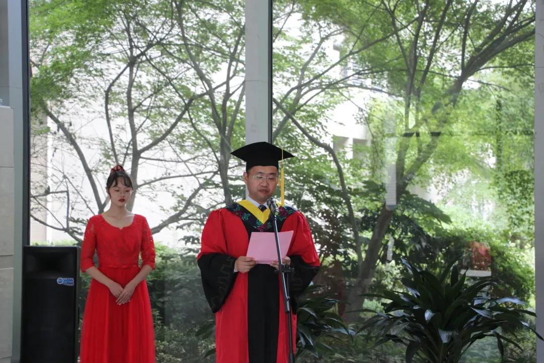 上午9时,学位授予仪式正式开始。其中,硕士学位授予仪式由副院长韩东太主持,党委书记伍小杰、院长郭楚文、党委副书记许宏志、副院长徐瑞东等学院领导及学院教授代表张建文、周忠宁、周娟、张保生为本届硕士毕业生拨苏正冠,颁发学位证书,并同他们合影留念。