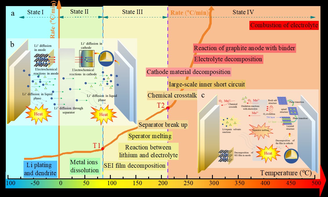 锂离子电池的热失控是电动汽车和电池储能系统的主要热危害,国内外学者都对此予以广泛关注。作者首先对锂离子电池热失控诱导因素进行分析,总结了主要的滥用条件以及热失控过程,并对其机理进行分析。当前,国内外学者普遍认为热失控的主要滥用条件包括机械滥用,电滥用和热滥用等,上述滥用条件可能会导致电池中的内短路(ISC)产生并导致温度快速升高,然后引起热失控。此外,当电池内部的温度足够高时,即使不发生ISC,由于正极和负极材料之间的化学串扰,高温下仍可能发生热失控。作者根据锂离子电池工作范围,总结了不同温度条件下可能热失控诱导过程中的内部反应机理,并对不同温度条件下的热失控诱导反应机理进行分析。最后,作者分别从材料、单体、系统尺度对响应的安全策略进行了总结,并针对目前电池热安全法中过程中存在的挑战和不足提出了可能的方向。