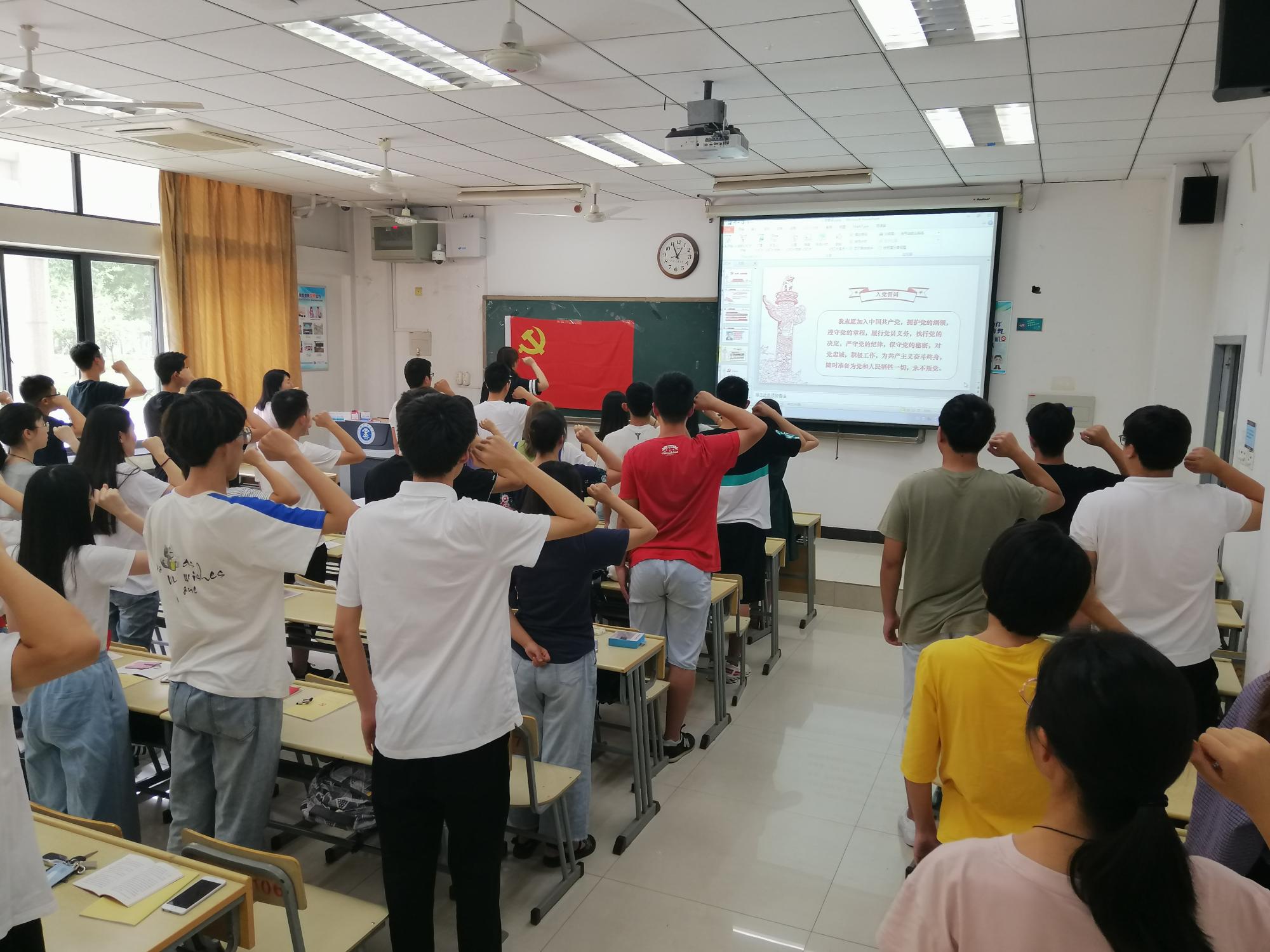 7月12日中午12时30分,电气与动力工程学院于博四C106举行2019年上半年新发展预备党员入党宣誓仪式。辅导员郭凯强老师、钟珊珊老师以及新发展的预备党员参加了本次入党宣誓仪式。